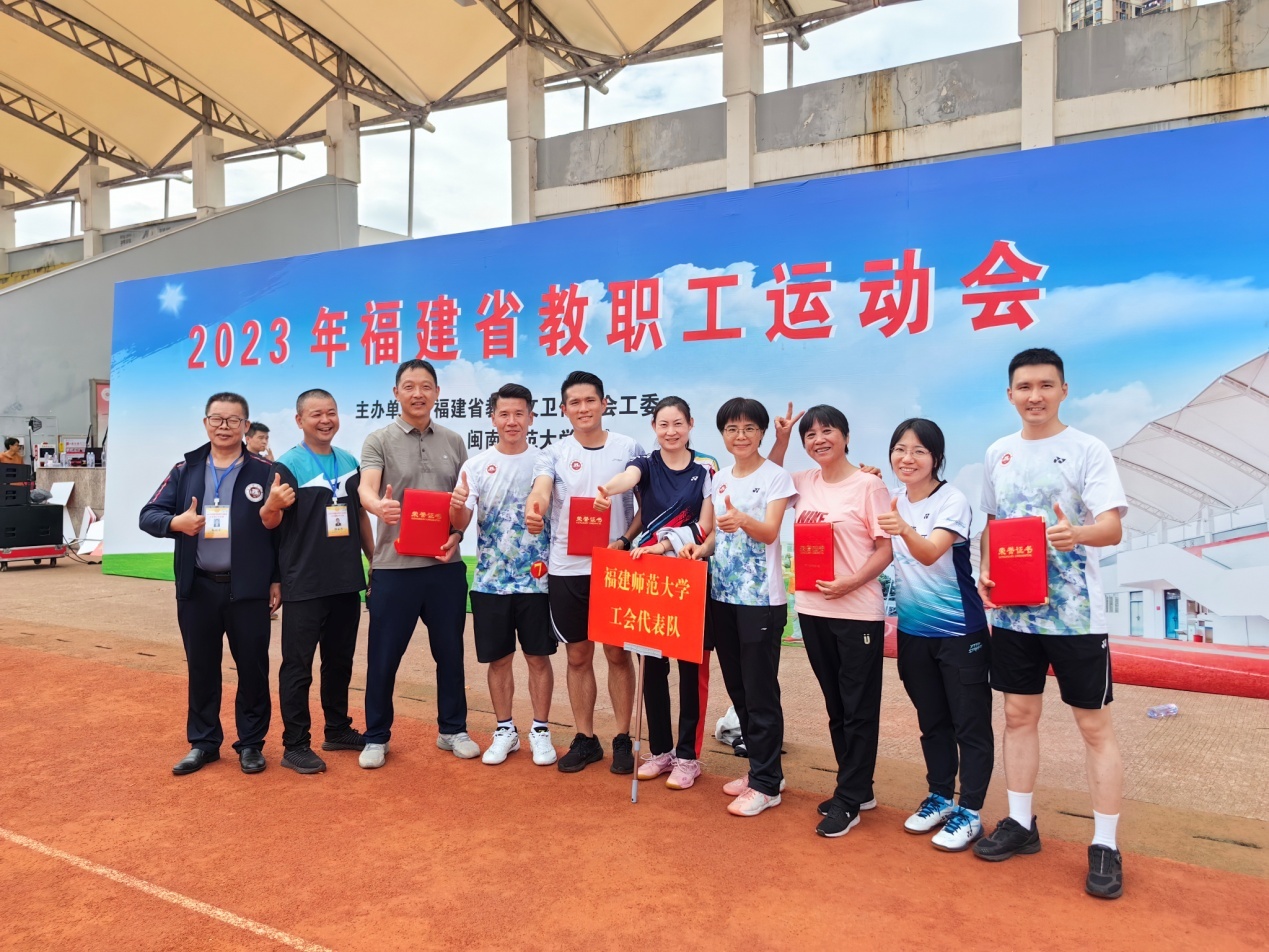 近日,2023年全省教职工运动会在闽南师范大学举行, 爱体育网_爱体育网(中国)派出了由刘炜、林震、林炎、刘政、陈妮、林静、朱瑞荣、吴勇、苏明、郭孟杰等10名教工组成的代表队参赛。经过激烈角逐,爱体育网_爱体育网(中国)教工羽毛球队获得羽毛球混合团体三等奖(第9名,本科高校最好成绩);2个组合分别获得扑克牌80分二等奖、三等奖。