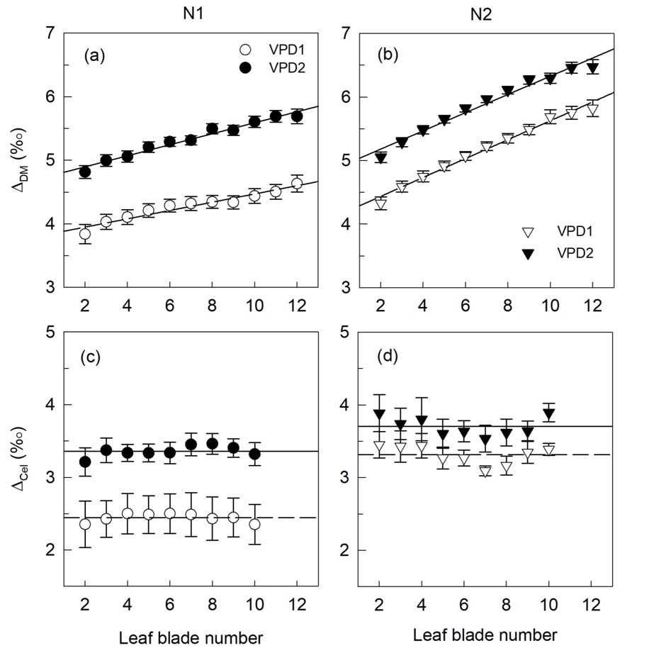 研究团队以C4植物糙隐子草(Cleistogenes squarrosa)为实验材料,通过严格控制环境δ13C的气候室实验,开展了氮素和大气水汽压差的双因素交互实验,利用叶片总有机质和纤维素的δ13C差异揭示了叶片在生长过程中逐渐贫化13C的后羧化分馏效应。同时建立了叶片碳周转和后羧化分馏模型,将后羧化分馏归因于呼吸和光合产物输出导致的分馏效应。由于年轻成熟叶和纤维素受后羧化分馏效应影响较小,并具有一致的环境响应特征,作者建议在相关研究中采用年轻成熟叶片或者纤维素作为研究材料,并且在采样过程中需要注意叶龄效应的潜在影响。