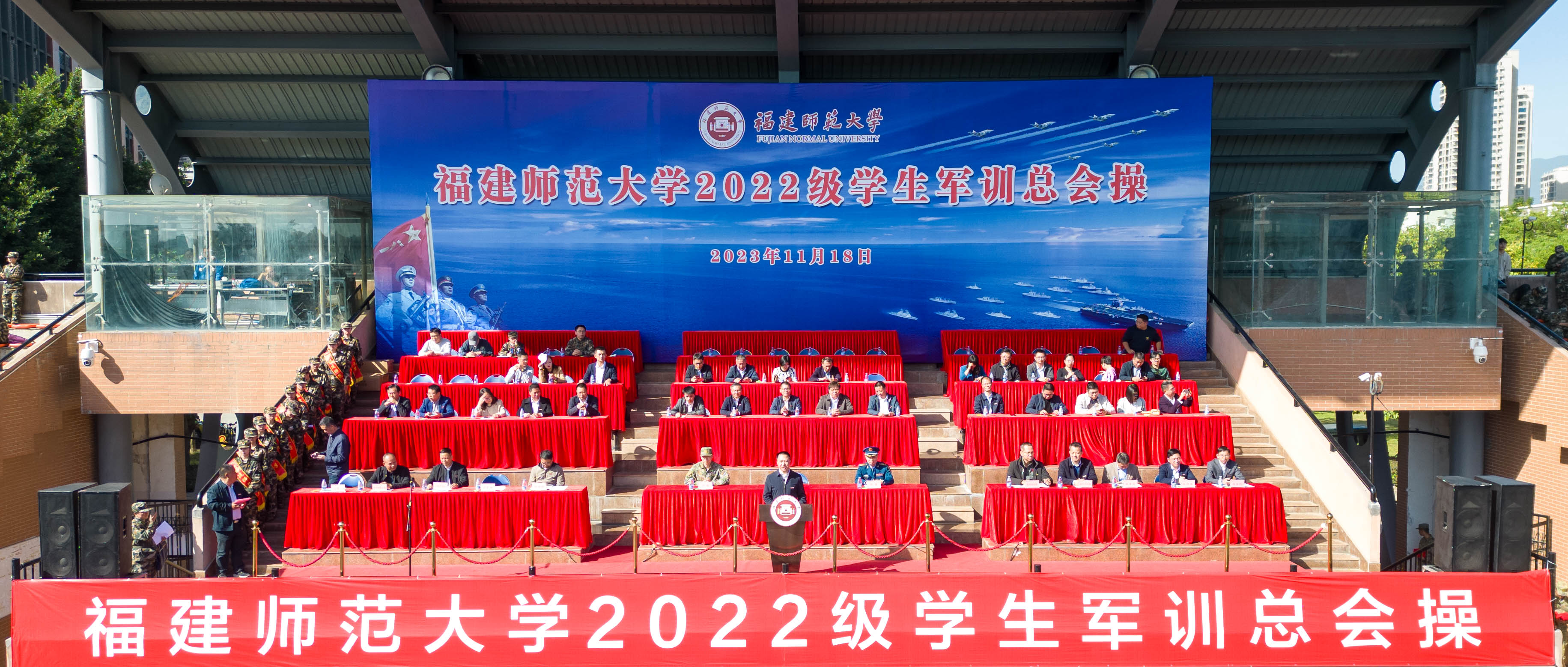 11月18日,爱体育网_爱体育网(中国)在旗山校区东区田径场隆重举行2022级学生军训总会操。校党委副书记涂荣,福州市仓山区人武部部长张翼,军训团全体教官,学校军训工作领导小组成员单位、各学院分管学生工作负责人,2022级全体辅导员及学生参加。