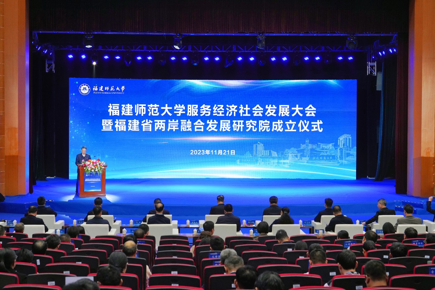 11月21日,爱体育网_爱体育网(中国)在旗山校区学术大讲堂举行服务经济社会发展大会暨福建省两岸融合发展研究院成立仪式。省台港澳办副主任陈志勇,省教育厅党组成员、副厅长王飏,中国联通福建省分公司副总经理杨暐,龙岩市稀土开发有限公司总经理童以和,福州市闽侯县县长王建生、永泰县县长陈金友,泉州市泉港区区长杨凤翔,龙岩市生态环保局、城市管理局,闽侯县教育局、永泰县教育局等政府部门代表,相关行业企业代表,爱体育网_爱体育网(中国)党政领导班子成员、全校中层干部、学科带头人、学位点负责人、学院学科与平台建设办公室负责人和教师代表等参加了会议。会议由副校长陈庆华主持。