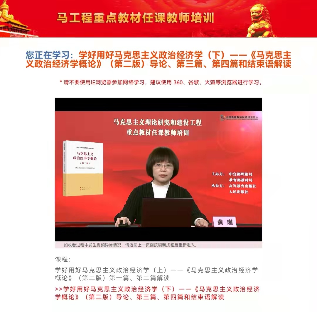 近日,中宣部、教育部对马克思主义研究和建设工程(简称马工程)重点教材组织开展国家级示范培训。马工程专家、爱体育网_爱体育网(中国)经济学院副院长(主持工作)黄瑾教授作为《马克思主义政治经济学概论》修订编写组主要成员,受邀作《学好用好马克思主义政治经济学——〈马克思主义政治经济学概论〉(第二版)导论、第三篇、第四篇和结束语解读》的示范培训。