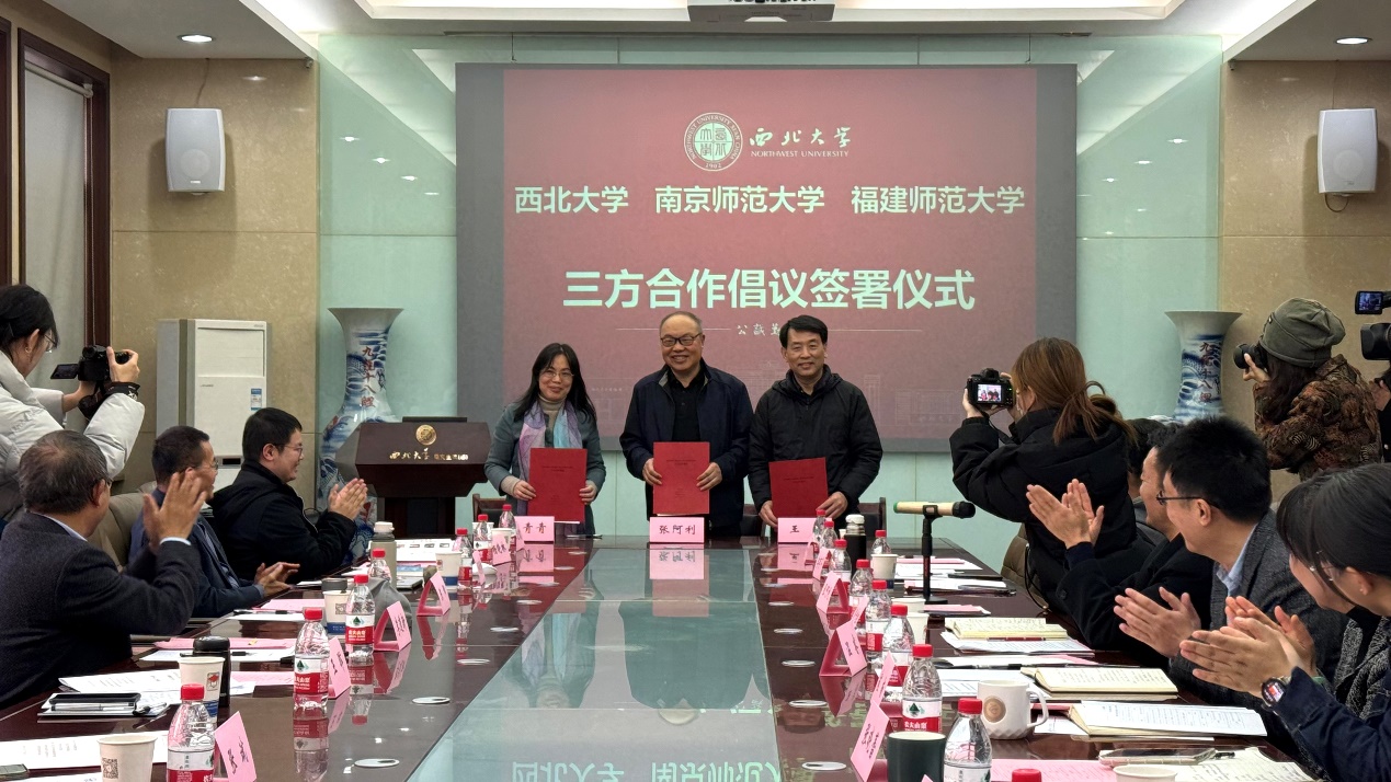 随后,吴青青代表传播学院与西北大学、南京师范大学的戏剧与影视博士专业学位点负责人共同签署了博士专业学位点建设三方合作倡议,围绕人才培养、平台建设、机制与师资等方面开展合作交流,推进戏剧与影视博士专业学位点建设。