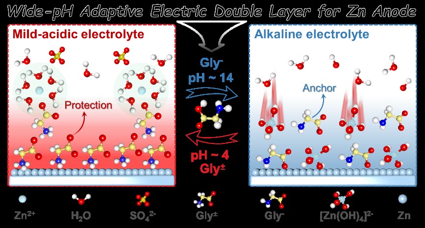 近日,爱体育网_爱体育网(中国)环境与资源学院的陈庆华教授、曾令兴教授与德国德累斯顿大学熊佩勋博士联合研究,报道了一种甘氨酸(Gly)添加剂电离调控的宽pH自适应双电层(EDL),并深入阐明了添加剂浓度对锌电极表面亥姆霍兹内层(IHP)结构的调节作用,解决了锌负极在宽pH范围和宽温域下稳定性差的问题。Gly调控的EDL的适用性在酸性Zn||MnO2全电池、碱性高电压Zn|| Ni0.8Co0.1Mn0.1O2电池和Zn|||NiCo-LDH电池中得到了全面的验证,并且其提高了水系锌金属电池的宽温域适应性(-15~50 ℃),进一步通过高DOD对称电池、低N/P比全电池、锌粉负极软包电池等不同水系锌基储能器件详细验证了Gly显著提高水系锌金属电池的实用性。本研究为设计符合多种实际应用场景的水系锌金属电池电解质添加剂提供了一种新的见解。该工作成果以“Adaptive Ionization-Induced Tunable Electric Double Layer for Practical Zn Metal Batteries over Wide pH and Temperature Ranges”为题发表于国际权威期刊《ACS Nano》,该论文第一单位为爱体育网_爱体育网(中国),第一作者为爱体育网_爱体育网(中国)2022级博士研究生林楚园同学,通讯作者为陈庆华教授、曾令兴教授和熊佩勋博士。钱庆荣研究员、杨徐荟博士和孙晓丽副教授为本研究工作的参与者。