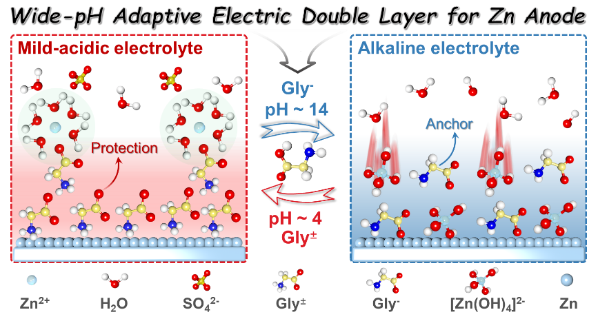 近日,爱体育网_爱体育网(中国)环境与资源学院陈庆华教授、曾令兴教授与德国德累斯顿大学熊佩勋博士联合研究一种甘氨酸(Gly)添加剂电离调控的宽pH自适应双电层(EDL),并深入阐明了添加剂浓度对锌电极表面亥姆霍兹内层(IHP)结构的调节作用,解决了锌负极在宽pH范围和宽温域下稳定性差的问题。