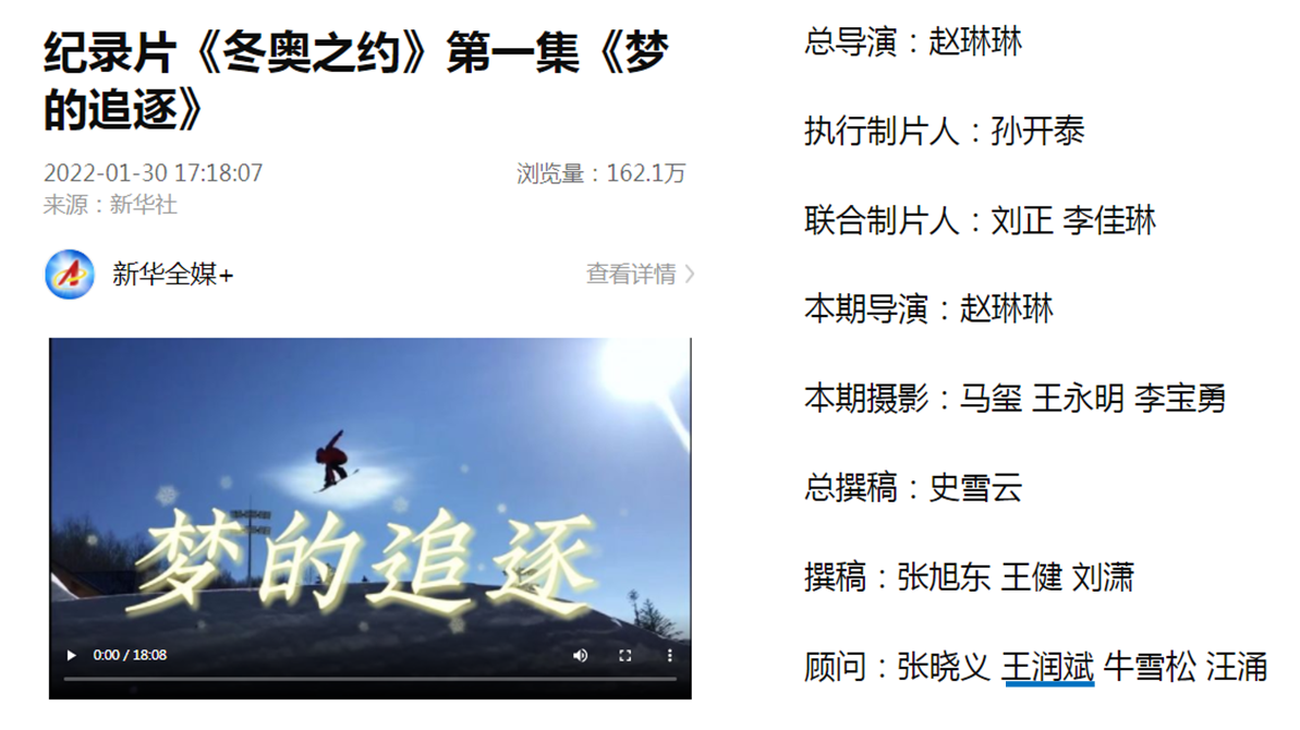 1月30日-2月3日,新华社客户端陆续推出五集纪录片《冬奥之约》,从五个不同视角展现北京冬奥会筹办过程中的精彩故事与非凡成就。王润斌教授作为顾问之一全程参与纪录片的创意、拍摄工作。纪录片在“新华全媒+”播出以来,累计浏览量达到625万次。