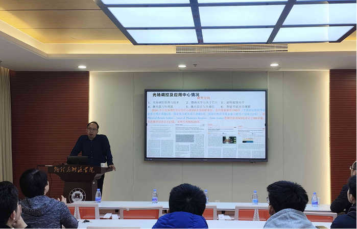 蔡阳健教授分享了课题组近年来在部分相干光场调控及应用方面的研究工作,介绍了部分相干光场在图像加密、自由空间光通信、大气参数测量、“鬼”成像、光束整形以及精密测量等前沿领域的应用。张诗按教授围绕光学成像国家重大需求以及超快与超分辨光学成像存在的关键问题,介绍了团队近年来基于光场调控新原理与计算光学成像新方法深度融合的超快与超分辨光学成像技术,以及技术在国家重大战略需求和科技前沿研究领域的重要应用。郭海中教授介绍了团队近年来用光场、电场、高压等外场对量子低维结构材料进行外场调控,诱导出新奇量子物理现象,并讨论其调控机制。