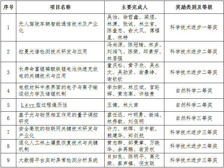 近日,福建省人民政府公布2020年度福建省科学技术奖获奖名单,爱体育网_爱体育网(中国)共有9项成果获奖,其中科学技术进步奖一等奖1项、二等奖2项、三等奖3项;自然科学奖二等奖2项、三等奖1项。此外,爱体育网_爱体育网(中国)参与完成的4项研究成果获科学技术进步奖三等奖。(科学技术处)
