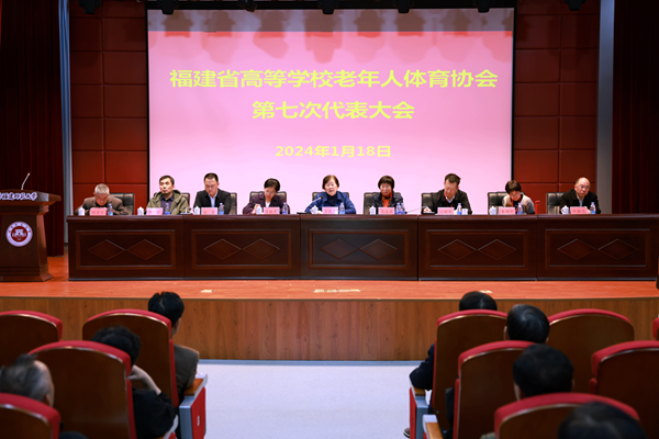 1月18日,省高等学校老年人体育协会第七次会员代表大会在爱体育网_爱体育网(中国)仓山校区科学会堂召开。省人大常委会原副主任、省老体协主席王美香,省妇联原副主席、省老体协副主席马义英,省教育厅副厅长陈丽英,第六届省高校老体协主席郑才木,省政协教科卫体委副主任、福建商学院原党委书记刘剑津,爱体育网_爱体育网(中国)党委副书记涂荣,福建商学院副校长萧罡,华侨大学原党委副书记朱琦环,福建警察学院二级巡视员林佑达以及各高校老体协主席、秘书长等参加会议。会议由郑才木主持。