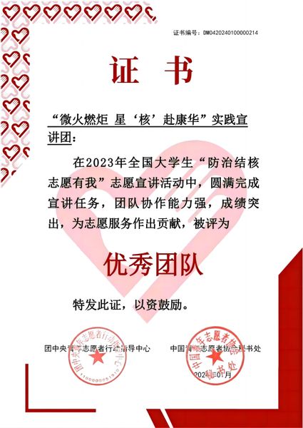 近日,由国家疾病预防控制局传染病防控司、团中央青年志愿者行动指导中心联合开展的2023年全国大学生“防治结核志愿有我”志愿宣讲活动优秀团队遴选结果揭晓。经济学院“微火燃炬星‘核’赴康华”志愿宣讲团获评“优秀团队”。为助力传播防治肺结核理论知识,经济学院“微火燃炬星‘核’赴康华”志愿宣讲团深入福建、广东两省的医院、学校、社区等场所,将防核实践融入多彩课堂,开展15场理论宣讲会、8场知识竞赛及10场调研活动,累计志愿服务时长达2042.9小时。(经济学院)