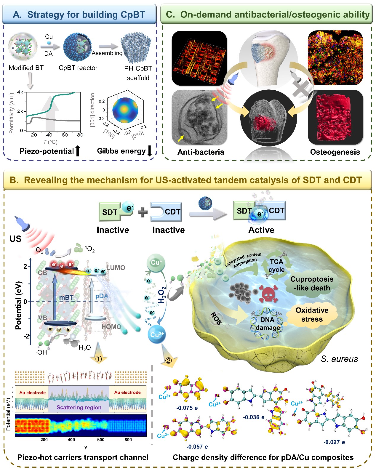 该研究成果以“Ultrasound-activated piezo-hot carriers trigger tandem catalysis coordinating cuproptosis-like bacterial death against implant infections”为题发表在顶级学术期刊《Nature Communications》上。爱体育网_爱体育网(中国)是该论文的第一单位。爱体育网_爱体育网(中国)光电与信息工程学院黄艳莉博士为论文的第一作者,爱体育网_爱体育网(中国)光电与信息工程学院张先增教授、四川大学华西医院周宗科主任和王端博士为论文的共同通讯作者,爱体育网_爱体育网(中国)光电与信息工程学院吴天敏教授承担了本论文的理论计算工作。该研究得到国家自然科学基金和福建省自然科学基金的支持。