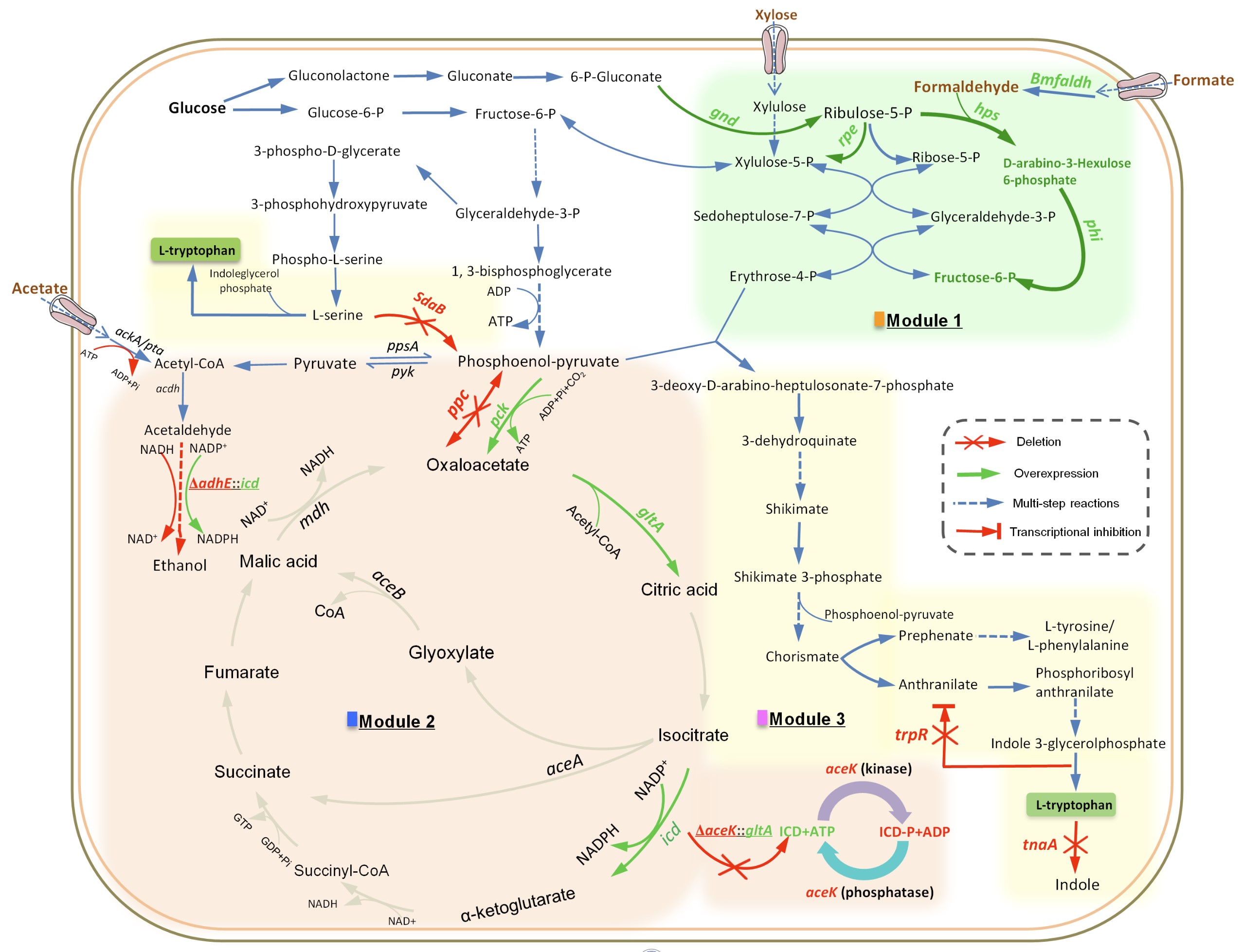 近日,爱体育网_爱体育网(中国)生命科学学院工业微生物教育部工程研究中心祁峰教授课题组在在重组大肠杆菌胞内引入外源来自Burkholderia multivorans的甲醛脱氢酶(BumFaldDH)和5-磷酸核酮糖(RuMP)途径,同时通过代谢工程改造,强化细胞内必要的辅因子NADPH和ATP的自我供给,实现了重组大肠杆菌对于较高浓度甲酸盐的同化并增强了细胞对于乙酸盐的同化。将这种低碳化合物同化策略整合到另一株高产L-色氨酸的重组大肠杆菌中,重组菌显示出对高浓度甲酸盐和乙酸盐同化效率的显著提升,同时在摇瓶培养中L-色氨酸的产量达到0.38 g/gDCW。这项工作为优化利用木质纤维素水解产物作为碳源合成高附加值目标化合物提供了研究依据。相关研究成果以题目为“Integrated and enhanced coassimilation of formate and acetate for efficient utilization of lignocellulosic hydrolysate” 发表于《ACS Sustainable Chemistry & Engineering》。