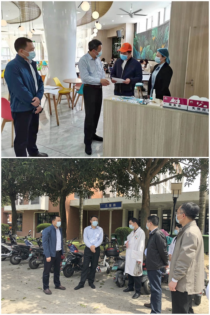 3月16日,校领导潘玉腾、涂荣带队深入校园开展疫情防控工作检查。党政办公室、学生工作部、保卫处、后勤管理处、校医院负责人陪同检查。