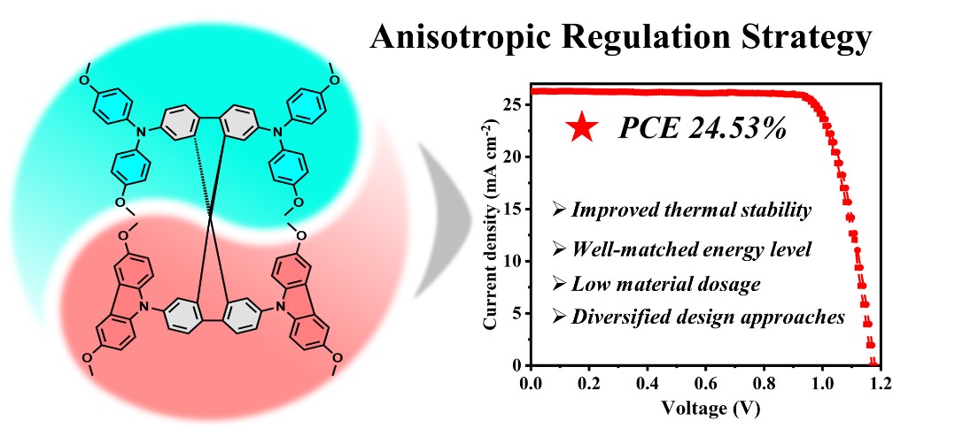 可溶液加工型钙钛矿太阳能电池凭借其制备成本低、产业生产链短、光电转化效率增速快等巨大优势,将成为下一代光伏技术的重要方向。目前高性能钙钛矿电池的空穴传输层都是基于传统螺环分子Spiro-OMeTAD,其本征迁移率低,成膜性差,且掺杂剂的使用会显著降低器件的稳定性。因此,如何合理设计具有高空穴迁移率和优越薄膜形貌的空穴传输材料以实现高效稳定的钙钛矿电池器件是目前领域内研究的重点。