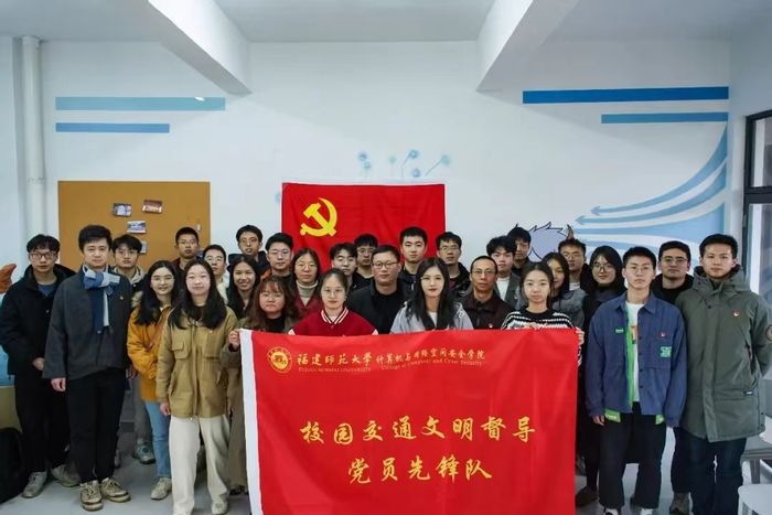 近日,计算机与网络空间安全学院在兰苑7号楼“一站式”学生社区举行校园交通文明督导党员先锋队成立大会暨党员宿舍授牌仪式。学院党委副书记邓胜柱、全体辅导员、学生党支部书记以及党员代表参加了活动。