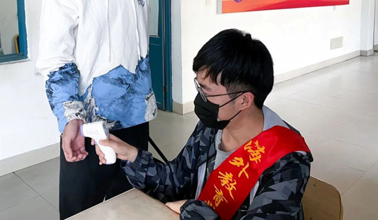 此外,同学们还开展午间自测、晚查寝体温检测,切实落实“早午晚”体温三检,织密“防控网”、筑牢“防疫墙”。