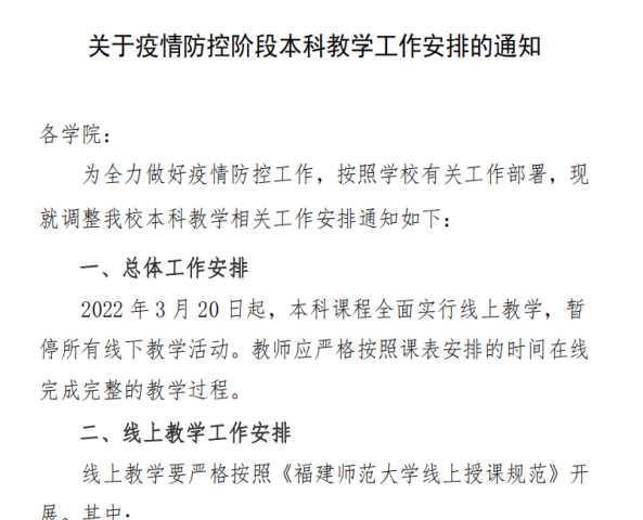 1月初,教务处出台《线上授课规范(试行)》,进一步细化了线上教学各项规范。2月24日,在新学期首次本科教学工作例会上,学校再次强调要始终绷紧疫情防控这跟弦,持续完善线上教学工作预案,不断夯实线上教学工作基础,力争在疫情的危机中育得先机、开创新局。3月13日,泉州疫情发生,教务处迅速发布《关于疫情防控阶段本科教学相关工作的通知》,要求各学院提前做好线上教学工作各项准备;17日,学校开始实行本科教学线上线下并行模式,理论课程全部实施线上教学,实验实践课程维持线下教学;20日,学校所有本科课程第一时间全面转为线上教学,迅速实现线上线下教学的“无痕”转换。
