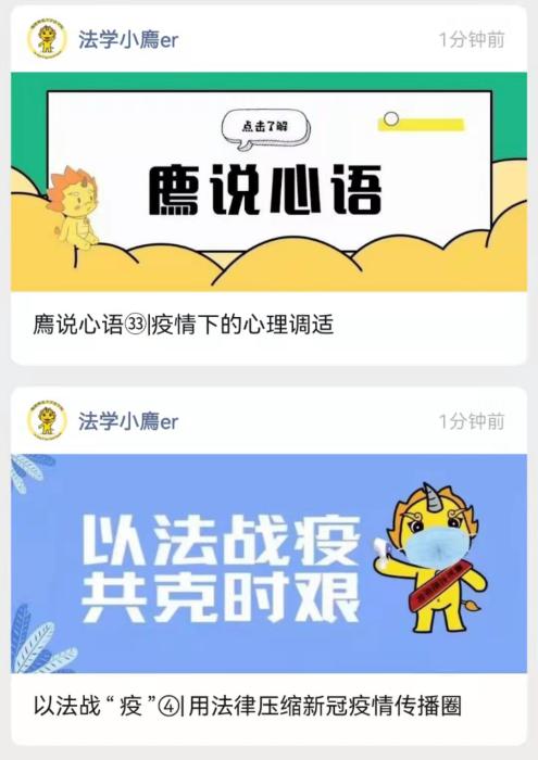 法学院从学生学习与生活实际出发,线上线下结合创新战疫新方法,护航战疫时光。在线上,学院微信公众号持续推出“以法战疫”“廌说安全”“廌说心语”等特色专栏,从法治、安全、心理等方面宣传防疫知识,拉起安全警戒线,织牢师生健康心灵网。在线下,法学院开展复试经验交流,设立学生网上复试专用间等,暖心举措显温度、提速度、强精度。