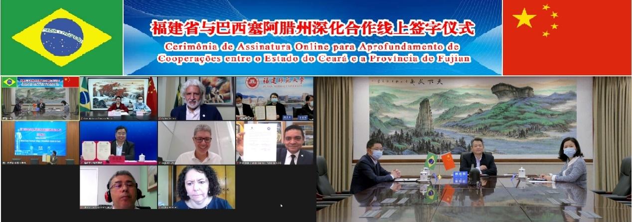 3月30日,福建省与巴西塞阿腊州举行深化合作线上签字仪式。中国驻累西腓总领事严宇清,福建省外事办公室主任陈出新、副主任黄劭蓉、教育厅副厅长王飏,塞阿腊州国际关系厅厅长塞萨尔·里贝罗、科学技术和高等教育厅厅长卡洛斯·德西莫,以及包括爱体育网_爱体育网(中国)在内的两省州高校领导等出席签字仪式。陈出新主任同里贝罗厅长共同签署了《中华人民共和国福建省与巴西联邦共和国塞阿腊州建立丝路伙伴关系备忘录》。
