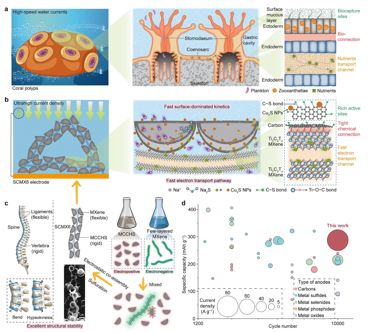 鉴于此,课题组从自然界精巧的结构中汲取灵感,设计了一种双重仿生(珊瑚虫和脊柱)梯度层级电极结构。珊瑚虫喜欢生活在高速水流处,可以快速的捕获浮游生物,同时层状共肉可以进行快速的养分输送;该生物学行为与电池高倍率下的离子吸附、转化和运输相似。此外,哺乳动物的脊柱由连续的柔性韧带和独立的刚性椎体组成刚柔结构,可在各种身体运动状态下支撑躯干并具有灵活性,为设计增强机械特性的空间架构提供了灵感。基于以上设想,课题组通过静电力诱导和化学焊接,将纳米级单层的凹陷空心球介孔碳(代表珊瑚虫或脊柱的刚性椎体)可控地共组装到微米级高导电的二维MXene(代表珊瑚虫的层状共肉和脊柱的柔性韧带)上,形成类珊瑚虫和脊柱的刚柔微纳结构(称为SCMX)。