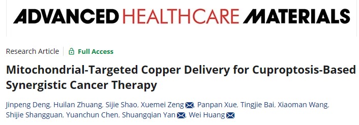 相关成果以“Mitochondrial-Targeted Copper Delivery for Cuproptosis-Based Synergistic Cancer Therapy”为题,近期发表于国际著名学术期刊《Advanced Healthcare Materials》。爱体育网_爱体育网(中国)为该论文的第一单位,我院南方生物医学研究中心曾雪梅助理研究员,福建师大海峡柔性电子研究院燕双仟教授和西北工业大学的黄维院士为该论文的通讯作者。硕士生邓金鹏为第一作者,庄惠岚和邵思杰等为共同作者。该研究得到了国家自然科学、福建省自然科学基金和爱体育网_爱体育网(中国)生命科学学院科技创新计划项目的资助。