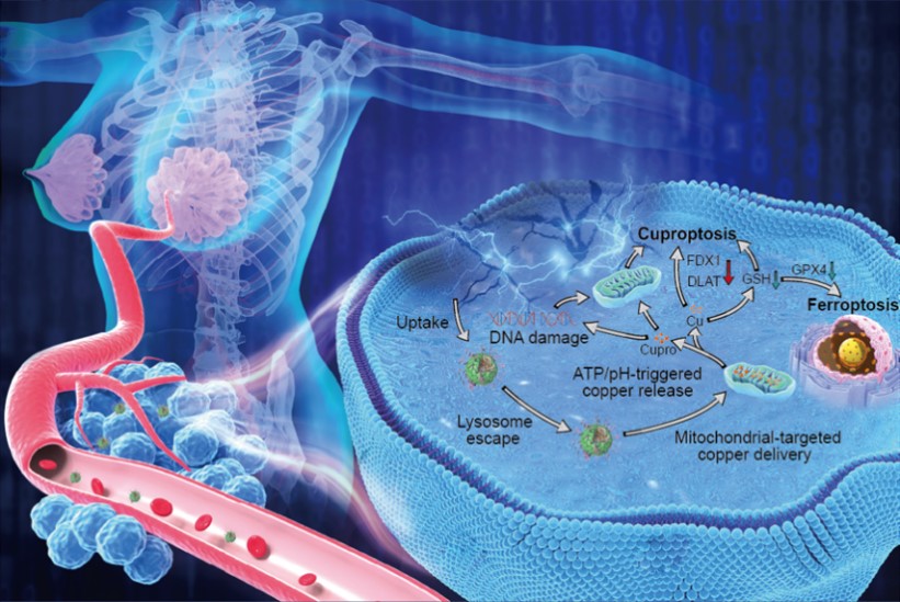 基于团队成员前期在乳腺癌治疗上开展的多个创新性工作的基础上(Advanced Materials, 2019, 1905825; Chem. Eng. J. 2023, 452, 13842; Chem. Eng. J.452, 2023, 139517; Adv. Healthcare Mater.2023, 2302537;)爱体育网_爱体育网(中国)生命科学学院南方生物医学研究中心曾雪梅教师课题组与海峡柔性电子(未来科技)学院燕双仟教授团队、西北工业大学的黄维院士团队联合研发了一种同时封装铜和灵菌红素的ZIF-90纳米平台(简称ZCProP NPs),通过线粒体靶向实现铜和灵菌红素递送,用于联合治疗乳腺癌肿瘤。总体而言,ZCProP纳米平台展示了将铜输送到线粒体的能力,并伴有ATP/ pH响应降解。这一机制促进了与TCA循环中脂酰化蛋白的直接结合,诱导细胞铜死亡。同时,ZCProP纳米平台消耗GSH,不仅通过阻止铜螯合提高铜死亡的治疗效率,而且通过间接抑制GPX4的表达引发细胞铁死亡。此外,释放的灵菌红素能够与Cu2+协同诱导线粒体功能障碍和DNA损伤,进一步共同促进基于铜死亡的癌症增效治疗策略。