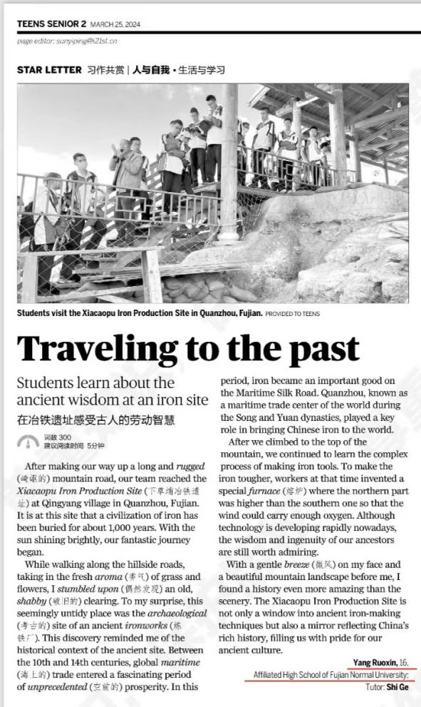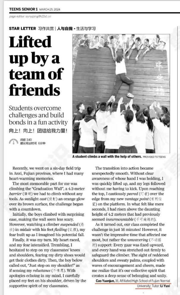 近日,《中国日报•二十一世纪学生英文报》刊发爱体育网_爱体育网(中国)附中高二年级学子曹袁珺、杨若欣的两篇英文文章,文中生动描述了附中在泉州安溪开展“行走的思政课”研学实践活动的体验和感悟,展现附中落实学科思政的育人成果。
