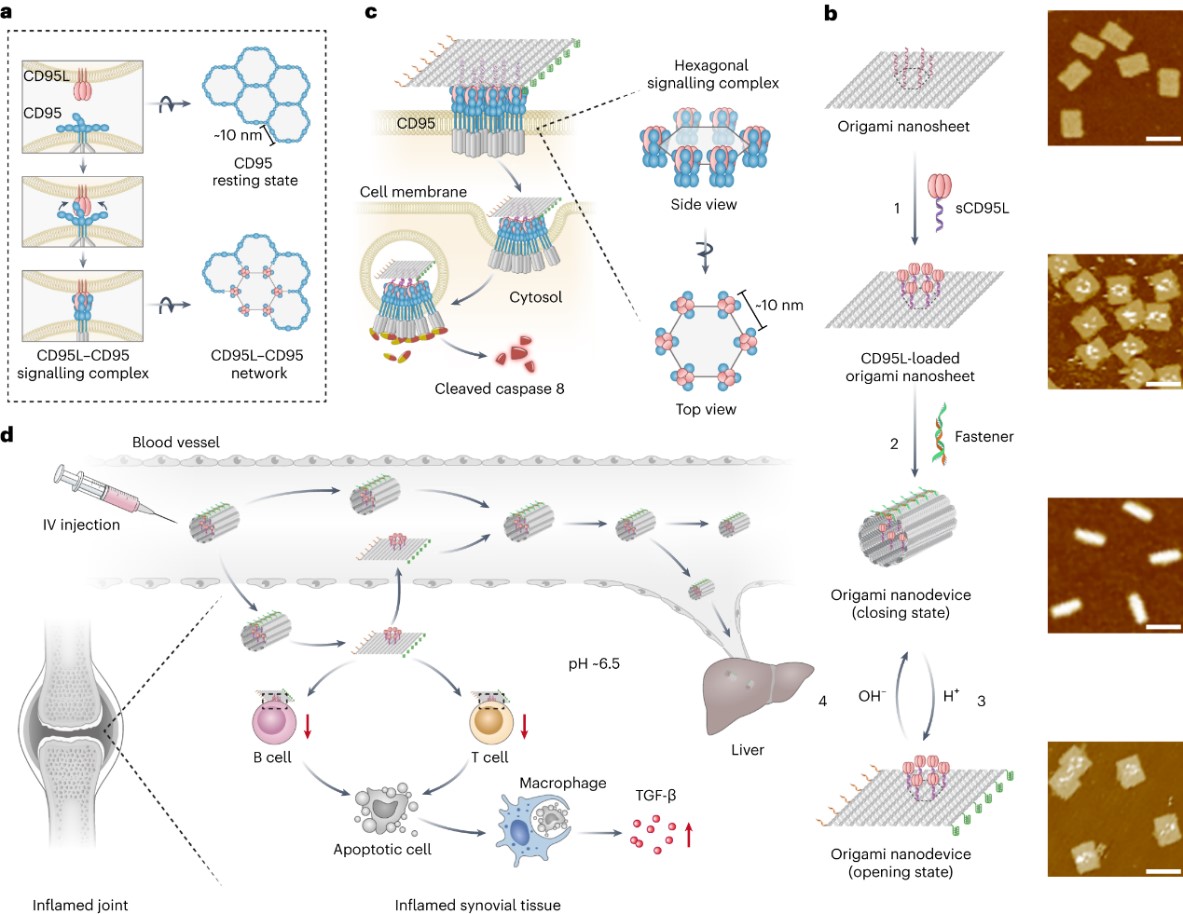 文章介绍了一种利用纳米级柔性可编程DNA折纸机器来调节炎症滑膜组织中活化免疫细胞的CD95致死诱导信号,从而建立局部免疫耐受以逆转RA的策略。它带有几何图案化的CD95配体,能调节免疫细胞信号,从而缓解类风湿性关节炎。随着pH值的变化,该装置可逆地从封闭构型转变为开放构型,显示出分子间距约为10 nm的CD95配体六边形图案,精确反映了免疫细胞表面CD95受体簇的空间排列。在胶原蛋白诱导的关节炎小鼠模型中,柔性DNA折纸在位于炎症滑膜组织中的活化免疫细胞中激发了强大的、选择性的CD95死亡诱导信号激活。这种局部免疫耐受可改善关节损伤,且无明显副作用。这种纳米机器可以对细胞信号进行精确的空间控制,拓展了我们对配体-受体相互作用的理解,是开发针对这些相互作用的药理干预的一个前景广阔的平台。