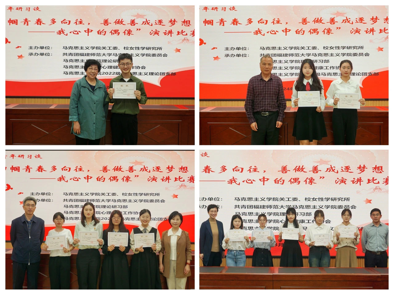 近日,由马克思主义学院关工委、校女性学研究所主办的“福师青年研习谈”暨“巾帼青春多向往,善做善成逐梦想——我心中的偶像”主题演讲比赛举行。院关工委綦正芳教授、王岗峰教授、俞志副教授,校女性学研究所所长吴宏洛教授,院党委副书记杨君火,副院长黄雯,全体辅导员及60余名学生代表到场观摩比赛。