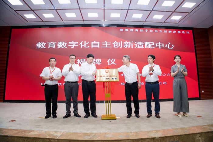 董中奇、许高峰、刘飞、协和学院副院长卢宇等4位专家分别作主旨发言,并围绕教育信创整机、芯片、操作系统应用及适配现状、未来趋势分析等方面进行交流,分享了教育行业系列应用解决方案、人才培养体系建设内容。顾鹏、胡志强、王瑞彬、李燕、刘飞和协和学院党委常务副书记陈林男共同为教育数字化自主创新适配中心揭牌。