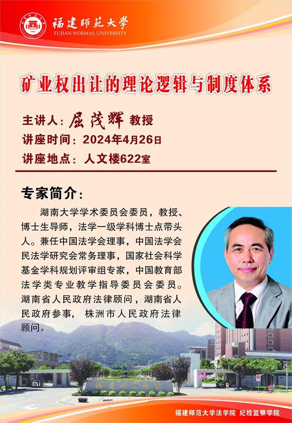 时间:2024年4月26日地点:人文楼622室主讲:屈茂辉 湖南大学学术委员会委员,教授、博士生导师主办:法学院、纪检监察学院专家简介:湖南大学学术委员会委员,教授、博士生导师,法学一级学科博士点带头人。兼任中国法学会理事,中国法学会民法学研究会常务理事,国家社会科学基金学科规划评审组专家,中国教育部法学类专业教学指导委员会委员。湖南省人民政府法律顾问 ,湖南省人民政府参事, 株洲市人民政府法律顾问。