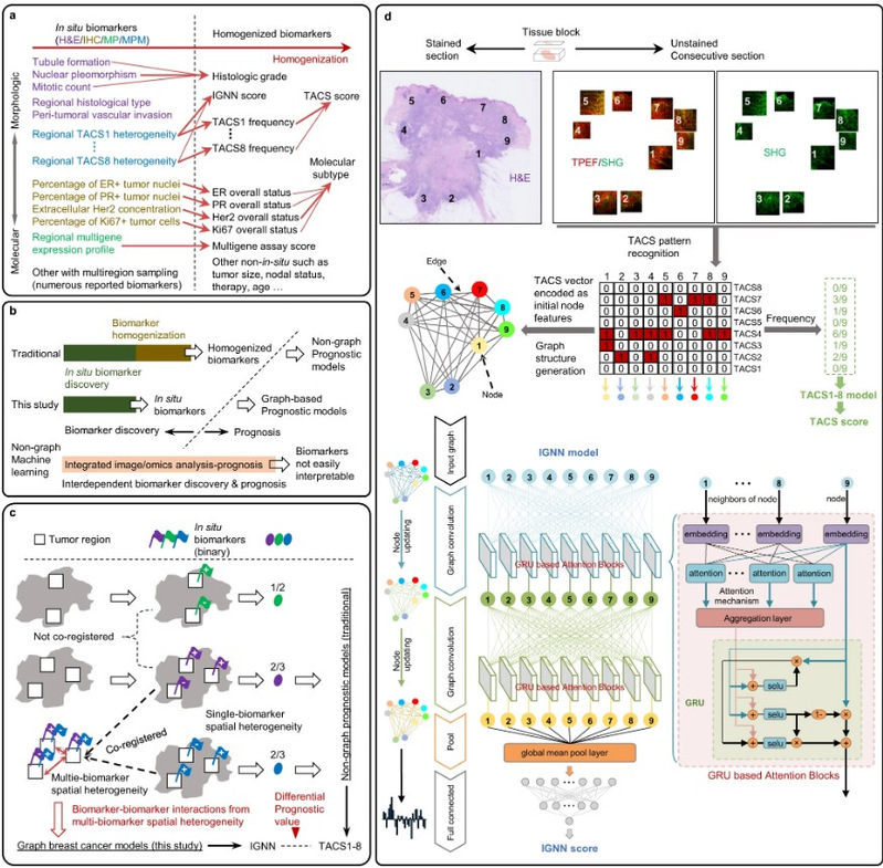 Recently, Professor Chen Jianxin and Dr. Li Lianhuang’s team from College of Photonic and Electronic Engineering of FNU, in collaboration with Dr. Tu Haohua’s team from University of Illinois at Urbana-Champaign, have made significant progress in the research on breast cancer prognosis. The research teams developed an intratumor graph neural network (IGNN) model for breast cancer prognosis, established the description and analysis paradigms for irregular Non-Euclidean data, and applied the paradigms to explore and interpret the implicit prognostic interactions among in situ biomarkers in multiple regions of heterogeneous breast tumors. Unlike various machine learning models, currently widely adopted in computational pathology, which obtain prognostic characteristics by inference, the IGNN model carries out graph structured coding and analysis of tumor related collagen characteristics (TACS1-8) obtained from multiphoton microscopy instead of relying on specific in situ biomarkers. The IGNN model reveals the hidden prognostic value of heterogeneous TACSs and achieves accurate and interpretable breast cancer prognosis.