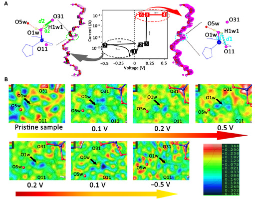 Recently, the research group, led by Prof. Zhang Zhangjing of College of Chemistry and Materials Science, has made new progress in the research on proton conduction MOFs-based resistive switching memory. The group replaced the traditional electron transport with ion transport, utilized the strategy of hydrogen proton transport commutation in the channels of MOFs under the action of different electric fields to implement resistive switching and rectifying effects in a single material simultaneously for the first time, and verified the mechanism of proton transport commutation under the action of the electric field through single crystal diffraction. The findings were published in Science Advances, a subject-specific journal of Science, in the form of the paper, entitled Simultaneous implementation of resistive switching and rectifying effects in a metal-organic framework with switched hydrogen bond pathway. [(2019) 5: Eaaw4515; DOI: 10.1126/sciadv.aaw4515, impact factor: 12.804]. The research results took Fujian Normal University as the first completion unit, with Prof. Zhang Zhangjing as the corresponding author.