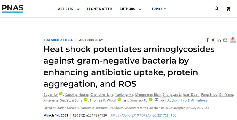 Bacterial antibiotic resistance has become a major public health issue in the world. Increasing the efficacy of existing antibiotics is a promising strategy against antibiotic resistance. The bacterial resistance research team led by Fu Xinmiao, a researcher in the College of Life Sciences of FNU, has developed a variety of new synergistic methods in recent years (Sci Rep, 2015; Front Microbiol, 2019; Front Cell Infect Microbiol, 2020; mBio, 2020; Front. Microbiol., 2021; Antimicrob Agents Chemother, 2022; ACS Infectious Diseases 2022, 2023), focusing on aminoglycoside antibiotics. Recently, the research group has made important progress in the field of antibiotic synergism, discovered that heat shock could dramatically enhance the efficacy of aminoglycoside antibiotics in killing various bacteria, and revealed its mechanism of action. The research findings were published in the top academic journal, Proceedings of the National Academy of Sciences (PNAS), in the form of research paper. This research helps to further understand the bactericidal mechanism of aminoglycoside antibiotics, and also lays a foundation for the development of new methods based on heat shock combined with aminoglycoside antibiotics in the treatment of clinical bacterial infections.