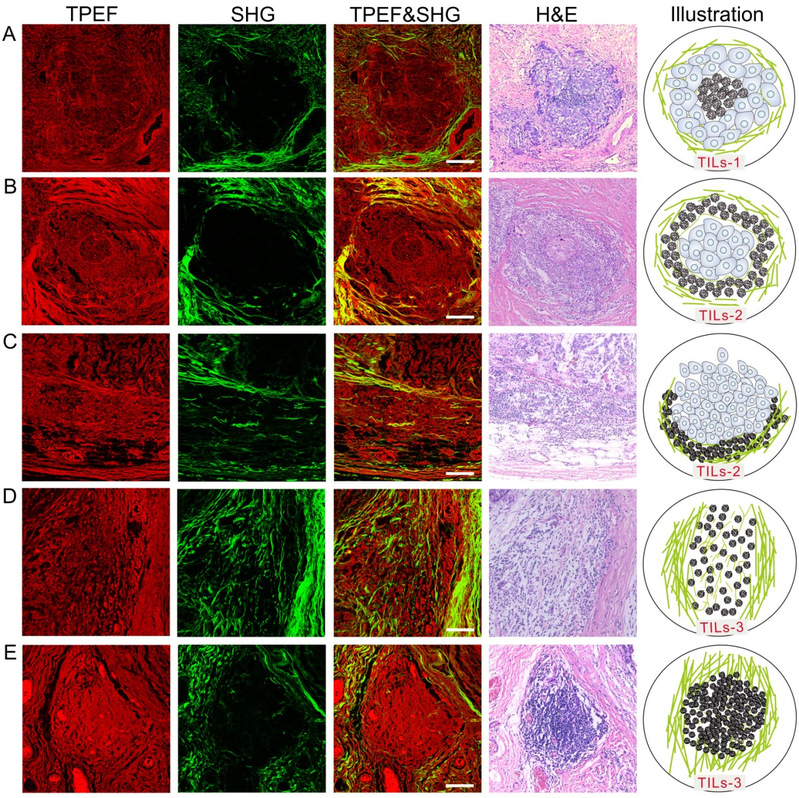 In the research, the team first used multi-photon microscope (MPM) for the imaging of TILs in the tumor micro-environment of 564 breast cancer patients. Then based on their relative positions with tumor cells and collagen fibers they redefined TILs as TILs1-3, and on the basis of the expression frequency of TILs1-3, they put forward a new method of assessing the prognostic value of TILs, and gave each patient a TILS-score through ridge regression analysis. The results of medical statistical analysis show that TILs-score is an independent prognostic factor for disease-free survival (DFS) and overall survival (OS) in breast cancer patients, and has greater prognostic value for ER-positive breast cancer patients. Among the ER-positive breast cancer patients, the combination of TILs-score and clinically independent factors will increase the AUC of a training group’s 5-year DFS (OS) to 0.814 (0,830), HR to 4.648 (7.006), and will increase the AUC of a validation group’s 5-year DFS (OS) to 0.804 (0.830), HR to 3.729 (5.132).