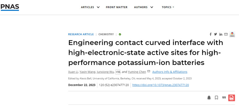 Recently, FNU Prof. Chen Yuming’s team reported that contact curved interfaces (CCIs) significantly enhance the electronic density of states around the Fermi level of carbonaceous materials, and that the high-electronic-state active sites of CCIs facilitate the potassium-ion adsorption and subsequently benefit potassium storage and rate capability using the first principles calculations. The research results, titled “Engineering contact curved interface with high-electronic-state active sites for high-performance potassium-ion batteries,” were published in PNAS, an international scholarly journal. FNU is the first affiliation of the paper, with Li Xuan, a doctoral student, Wang Yaxin, a master student, and Fellow Wu Junxiong, as the co-first authors, FNU Professors Chen Yuming and Li Xiaoyan and Professor Wang Guoxiu of University of Technology Sydney as the co-corresponding authors, and Professor Chen Qinghua and Lecturer Chen Xiaochuan as participants. The work was supported by the Youth Project of National Major Talents Plan, National Natural Science Foundation of China, Fuzhou-Xiamen-Quanzhou Collaborative Innovation Platform, Industry-University-Research Joint Innovation Project of Fujian Province, High-level Talent Fund Project of Fujian Normal University, and so on.