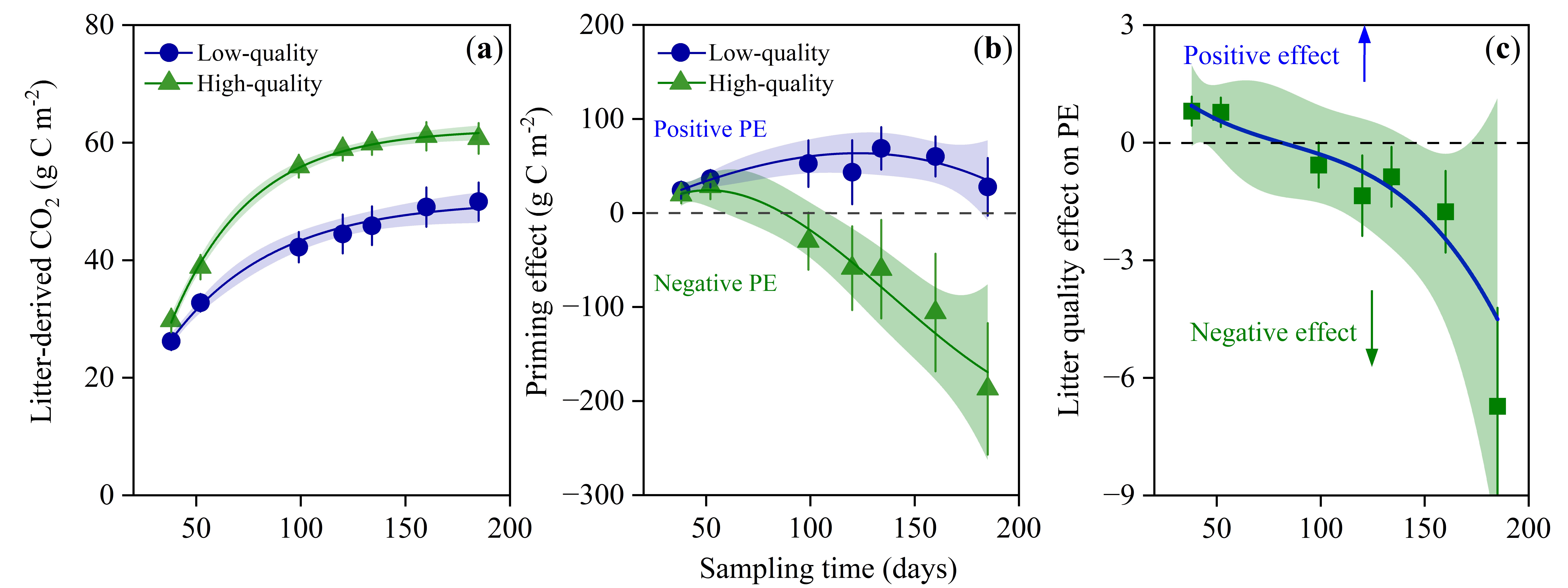鉴于此,本研究以在侵蚀退化地上经过40多年的恢复的马尾松纯林为研究对象,在野外原位条件下,采用13C同位素示踪技术,通过在马尾松林土壤中添加13C标记的低质量马尾松和高质量木荷凋落叶,探究不同凋落物输入所诱导的激发效应的差异及影响机制。研究表明,当添加低质量凋落物时,土壤微生物偏好利用易分解的凋落物,从而促进土壤有机碳分解激发效应。随着凋落物的剩余成分更难分解,微生物转向分解土壤有机质,最终以微生物残体等形式返回土壤,形成新的土壤有机质。高质量凋落物被土壤微生物优先转化利用,缓解养分的限制,减弱了土壤碳分解的激发效应,以促进有机碳积累。该研究成果对精准提升退化森林质量和碳汇能力具有重要的意义,并强调了种植或混交具有相对高质量凋落物的树种是提高南方红壤区退化马尾松林土壤固碳存的重要途径。
