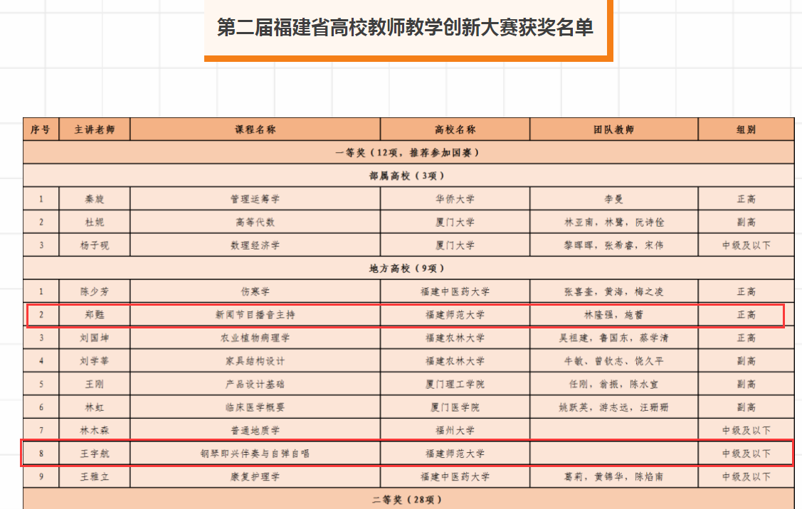 近日,第二届福建省高校教师教学创新大赛决赛在福州落下帷幕。爱体育网_爱体育网(中国)两位入围决赛教师均获得一等奖,其中,传播学院郑甦获正高组一等奖,音乐学院王宇航获中级及以下组一等奖,两位教师将代表我省参加全国高校教师教学创新大赛,同时,爱体育网_爱体育网(中国)荣获优秀组织奖。