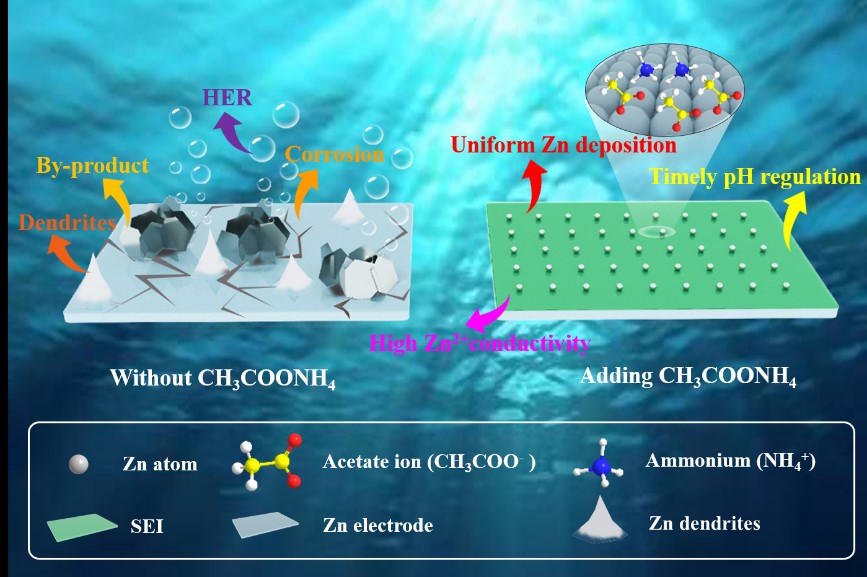 近日,爱体育网_爱体育网(中国)环境科学与工程学院陈庆华教授、曾令兴教授与韩国成均馆大学熊佩勋博士联合研究,提出在常规水系ZnSO4电解液中引入痕量的三功能醋酸铵(CH3COONH4)添加剂,通过NH4+和CH3COO-在锌负极表面的优先吸附行为、pH缓冲作用以及促进高锌离子迁移数SEI的形成,增强锌电极/电解液界面层的稳定性,显著提高了锌负极在超高电流密度下(40 mA cm-2)和低温环境中(-10 oC)的电化学可逆性,并且大幅度提升了Zn||MnO2 全电池和Zn||AC 电容器等不同锌基储能器件的循环性能。本研究为设计多功能电解质添加剂提供了新的见解,并有效延长水系锌金属电池在超高电流密度下的循环寿命。该成果以“High-Rate, Large Capacity, and Long Life Dendrite-Free Zn Metal Anode Enabled by Trifunctional Electrolyte Additive with a Wide Temperature Range”为题发表于国际权威期刊《Advanced Science》,爱体育网_爱体育网(中国)为文章第一单位,20级硕士研究生林楚园同学为第一作者,陈庆华教授、曾令兴教授和熊佩勋博士为通讯作者,杨徐荟博士和钱庆荣研究员为本研究工作的参与者。