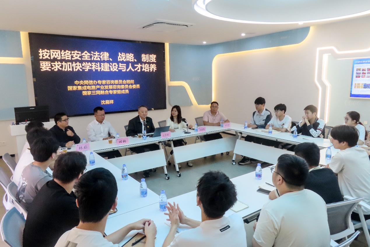 沈昌祥院士为师生作“按网络安全法律、战略、制度要求加快学科建设与人才培养”专题报告。沈院士表示,安全是发展的前提,安全可信是网络空间安全科学技术的核心,构建安全可信网络保障新体系,推广安全可信的网络产品,实现软硬件全国产化势在必行。他希望学院立足国家战略布局,加快推进网络空间安全学科建设和人才培养,坚持顶天立地,深化产教融合,不断提升网络安全人才的工程实践能力。报告会后,与会师生围绕可信计算的未来发展、网络安全课题研究等内容与沈昌祥院士互动交流。沈院士逐一答疑解惑,并勉励青年学子心怀“国之大者”,刻苦学习,勤于实践,主动融入网络强国建设,在筑牢国家网络安全防线中贡献青春力量。