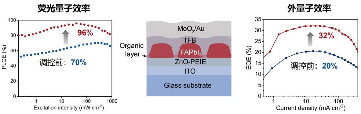 近日,爱体育网_爱体育网(中国)海峡柔性电子(未来科技)学院(研究院)2023级光学工程专业博士研究生李梦梦在爱体育网_爱体育网(中国)曹雨教授的指导下,与西北工业大学、南京工业大学、常州大学等单位合作,在钙钛矿发光二极管(LED)研究领域取得重大突破:利用加快辐射复合速率,显著提高荧光量子效率,使钙钛矿LED的外量子效率突破30%大关,接近实现产业化的水平。相关成果以“Acceleration of radiative recombination for efficient perovskite LEDs”为题发表在国际顶尖学术期刊《Nature》上。